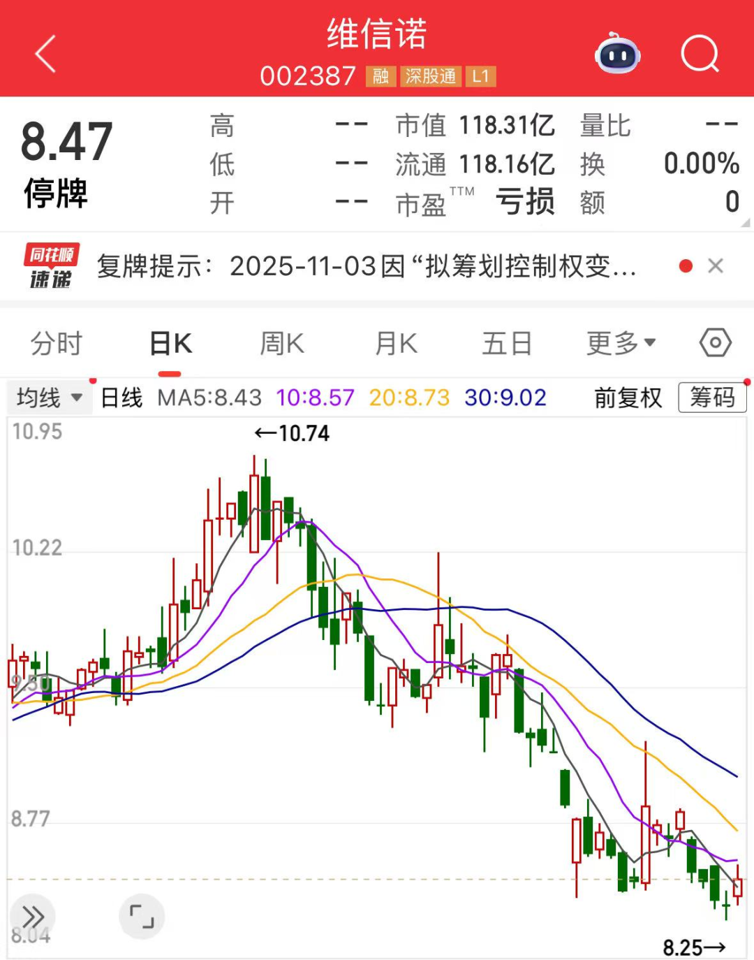 停牌前,維信諾股價為8.47元/股,總市值118.31億元。
