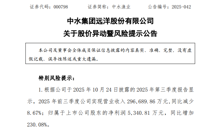 對(duì)于近期股價(jià)異動(dòng),中水漁業(yè)提示,根據(jù)公司于2025年10月24日披露的2025年第三季度報(bào)告顯示,2025年前三季度公司實(shí)現(xiàn)營(yíng)業(yè)收入29.67億元,同比減少8.67%;歸母凈利潤(rùn)5340.81萬元,同比增加230.08%。