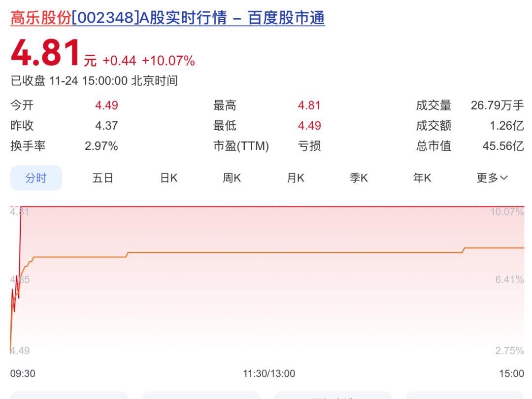 高樂股份今日漲停,截至今日收盤股價報4.81元/股。