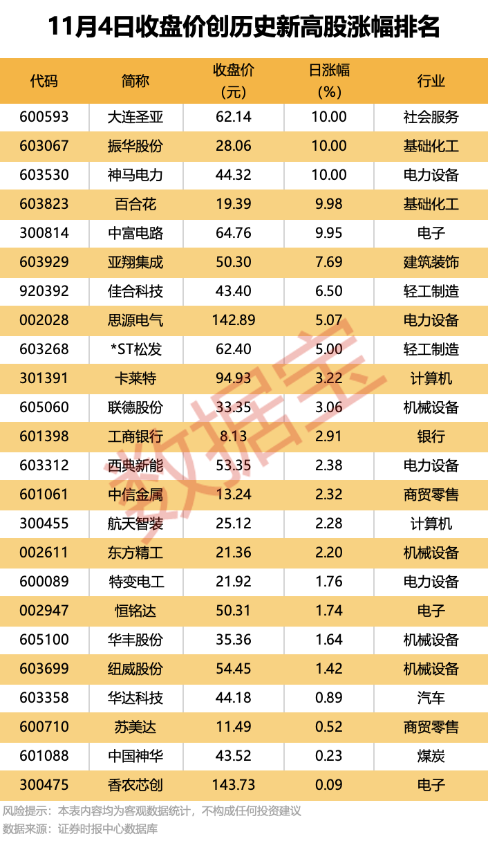 收盤(pán)價(jià)創(chuàng)歷史新高股中,今日股價(jià)平均上漲4.2%,漲停的有振華股份(603067)、大連圣亞(600593)、神馬電力(603530)等,漲幅居前的有中富電路(300814)、亞翔集成(603929)、佳合科技等。