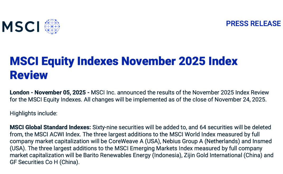 MSCI宣布2025年11月指數(shù)審核結(jié)果 來源:MSCI網(wǎng)站