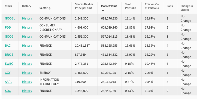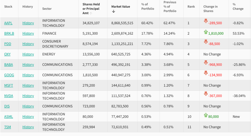 截至三季度末,H&H 基金的前十大重倉股分別為蘋果、伯克希爾B、拼多多、西方石油、阿里巴巴、谷歌、微軟、英偉達(dá)、迪士尼、阿斯麥。其中,蘋果仍然是第一大重倉,經(jīng)歷連續(xù)四個(gè)季度減持后,期末持股市值仍高達(dá)89億美元,占總倉位的60%。
