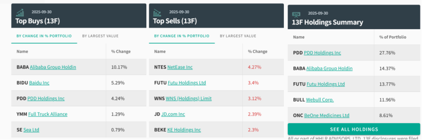此外,高瓴HHLR還對(duì)富途、網(wǎng)易、逸仙電商、京東、貝殼進(jìn)行了減持。截至三季度末,HHLR Advisors的前十大重倉股分別是,拼多多、阿里巴巴、富途、微牛、百濟(jì)神州、百度、傳奇生物、網(wǎng)易、ArriVent BioPharma、貝殼。