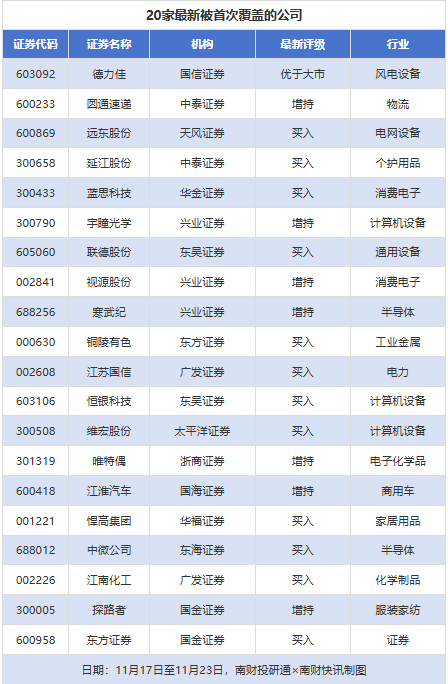 首次覆蓋方面,11月17日至11月23日券商共給出了77次首次覆蓋,其中德力佳(603092)獲得國信證券給予“優(yōu)于大市”評級,圓通速遞(600233)、延江股份(300658)獲得中泰證券(600918)分別給予“增持”“買入”評級,遠(yuǎn)東股份(600869)獲得天風(fēng)證券(601162)給予“買入”評級,藍(lán)思科技(300433)獲得華金證券給予“買入”評級。