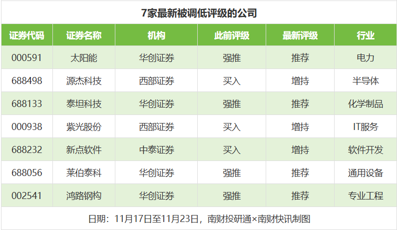 評級調(diào)低方面,11月17日至11月23日,券商調(diào)低上市公司評級達(dá)到7家次,最新數(shù)據(jù)包括了華創(chuàng)證券對太陽能的評級從“強(qiáng)推”調(diào)低至“推薦”,西部證券(002673)對源杰科技的評級從“買入”調(diào)低至“增持”,華創(chuàng)證券對泰坦科技的評級從“強(qiáng)推”調(diào)低至“推薦”。