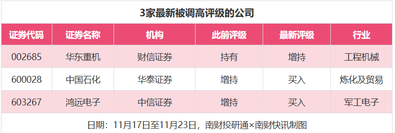 評級調(diào)高方面,11月17日至11月23日,券商調(diào)高上市公司評級達(dá)到3家次,最新數(shù)據(jù)包括了財(cái)信證券對華東重機(jī)(002685)的評級從“持有”調(diào)高至“增持”,華泰證券對中國石化(600028)的評級從“增持”調(diào)高至“買入”,中信證券對鴻遠(yuǎn)電子(603267)的評級從“增持”調(diào)高至“買入”。