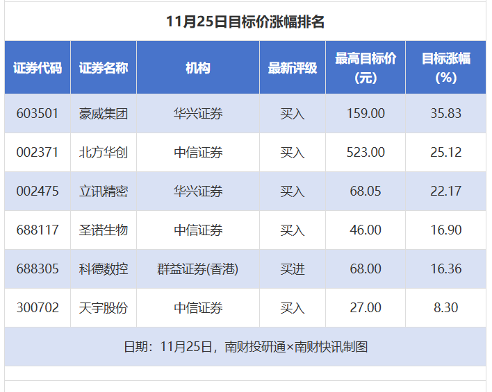 南財投研通數(shù)據(jù)顯示,11月25日,券商給予上市公司目標價共6次,按最新收盤價計算,目標價漲幅排名居前的公司有豪威集團(603501)、北方華創(chuàng)(002371)、立訊精密(002475),目標價漲幅分別為35.83%、25.12%、22.17%,前兩者都屬于半導體行業(yè)、后者屬于消費電子行業(yè)。