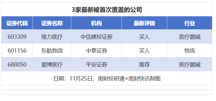 首次覆蓋方面,11月25日券商共給出了3次首次覆蓋,其中維力醫(yī)療獲得中信建投(601066)證券給予“買入”評級,東航物流獲得中泰證券(600918)給予“買入”評級,愛博醫(yī)療獲得平安證券給予“推薦”評級。