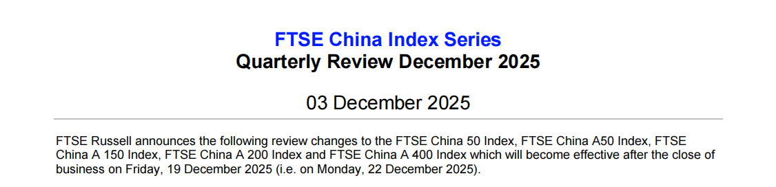12月3日,富時(shí)羅素宣布對(duì)富時(shí)中國(guó)50指數(shù)、富時(shí)中國(guó)A50指數(shù)、富時(shí)中國(guó)A150指數(shù)、富時(shí)中國(guó)A200指數(shù)、富時(shí)中國(guó)A400指數(shù)的審核變更。該變更將于2025年12月19日星期五收盤(pán)后(即2025年12月22日星期一)生效。