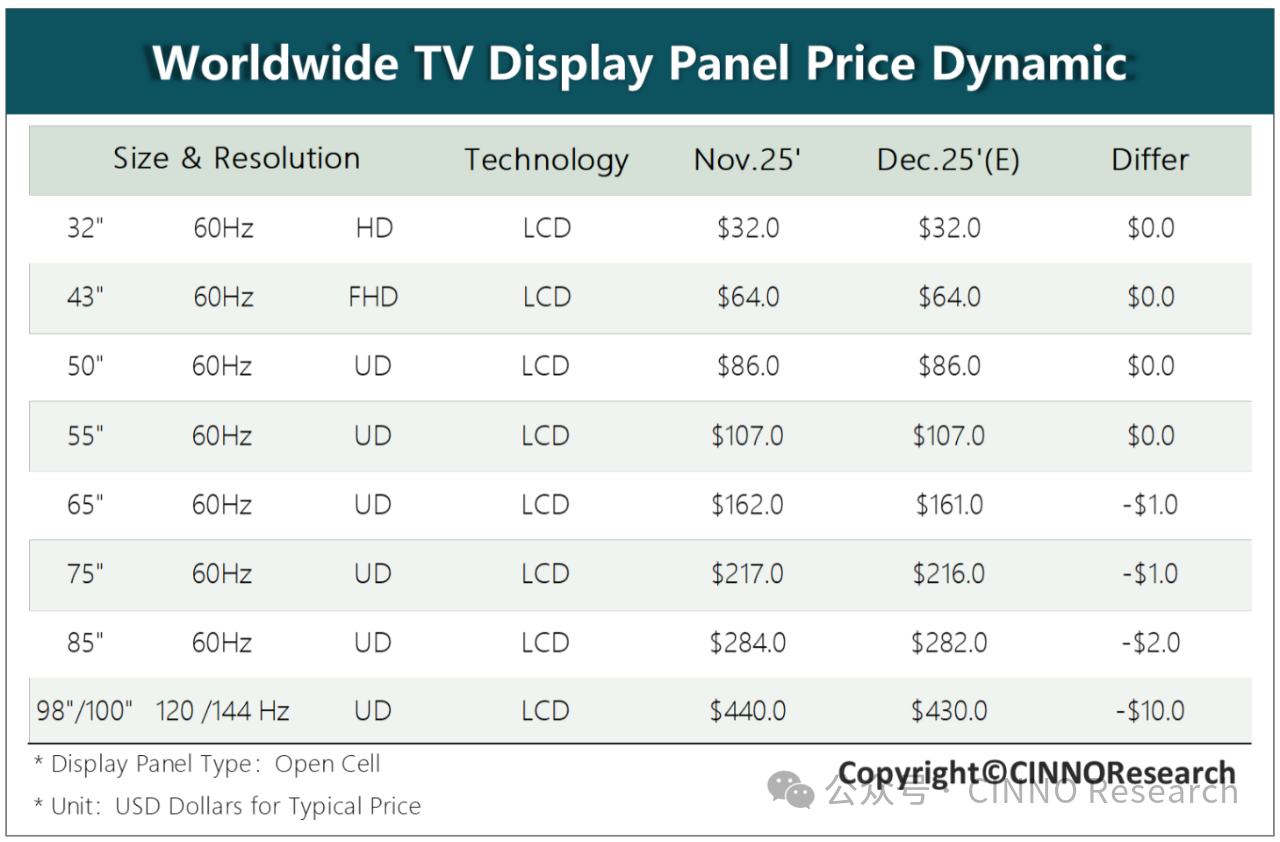CINNO Research:12月電視面板價格走勢分化 中小尺寸企穩(wěn)大尺寸續(xù)跌