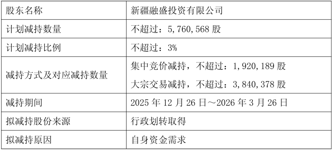 12月5日晚間,統(tǒng)一股份(600506)發(fā)布公告稱(chēng),公司大股東融盛投資計(jì)劃在2025年12月26日至2026年3月26日期間,通過(guò)集中競(jìng)價(jià)或大宗交易方式減持股份數(shù)量合計(jì)不超過(guò)576.06萬(wàn)股,不超過(guò)公司總股本的3%。