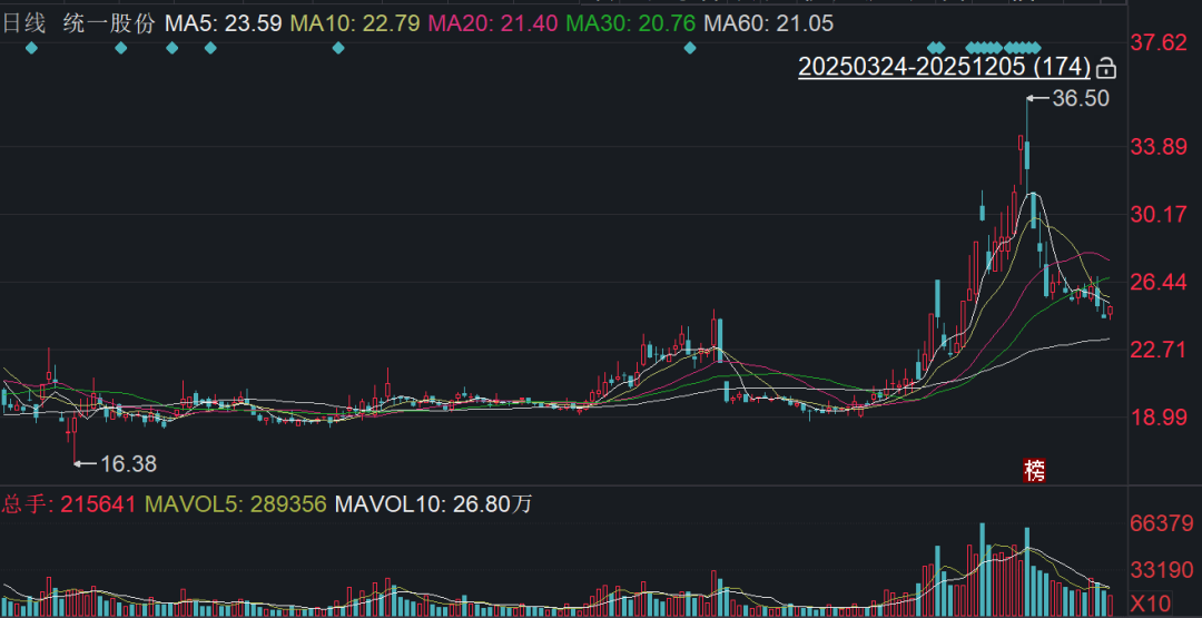 二級(jí)市場(chǎng)上,截至12月5日收盤(pán),統(tǒng)一股份上漲2.54%報(bào)25.02元/股,總市值約48.04億元,今年來(lái)公司股價(jià)累計(jì)上漲約兩成。