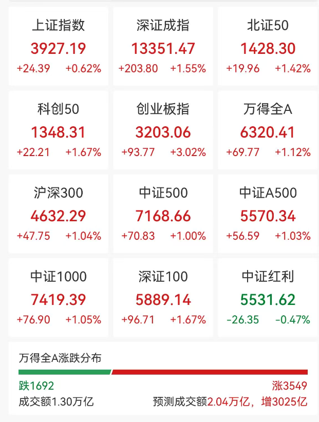 12月8日,A股市場(chǎng)早盤震蕩反彈,截至早盤收盤,滬指漲0.62%,深成指漲1.55%,創(chuàng)業(yè)板指漲3.02%。滬深兩市半日成交額1.30萬(wàn)億,較上個(gè)交易日放量3025億。全市場(chǎng)超3500只個(gè)股上漲。