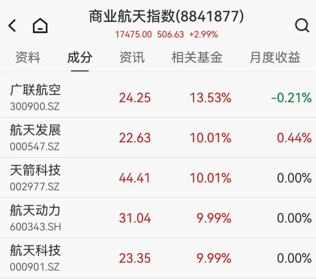 商業(yè)航天概念延續(xù)強(qiáng)勢(shì),順灝股份(002565)7天6板,龍洲股份(002682)、航天動(dòng)力(600343)等10余股漲停。