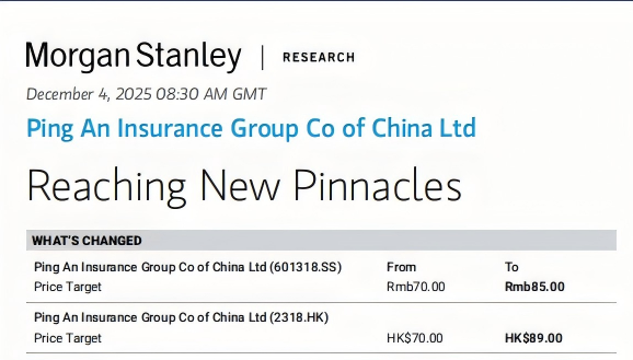 在這份最新研報(bào)中,摩根士丹利稱中國(guó)平安“正邁向新的輝煌”,給予“增持”,并將中國(guó)平安A股目標(biāo)價(jià)從70元上調(diào)至85元,H股目標(biāo)價(jià)從70港元上調(diào)至89港元。