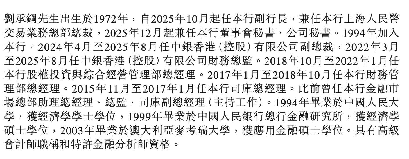 簡歷信息顯示,劉承鋼自2025年10月起任中國銀行副行長,兼任中國銀行上海人民幣交易業(yè)務(wù)總部總裁。