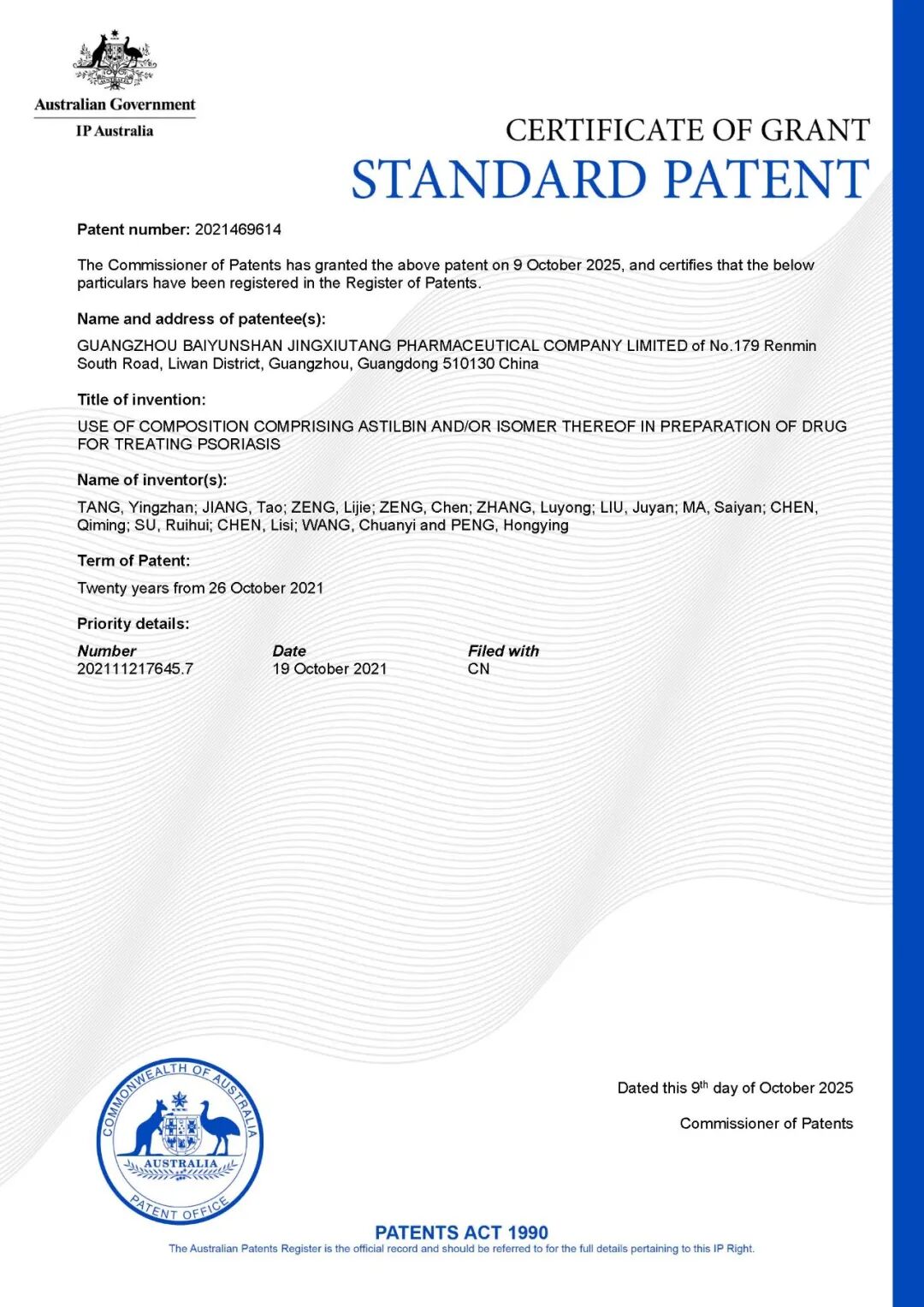 近日,廣藥集團(tuán)旗下白云山敬修堂自主研發(fā)的首個(gè)PCT國(guó)際專(zhuān)利“USE OF COMPOSITION COMPRISING ASTILBIN AND/OR ISOMER THEREOF IN PREPARATION OF DRUG FOR TREATING PSORIASIS”(一種包含落新婦苷和/或其異構(gòu)體的組合物在制備治療銀屑病的藥物中的用途)正式獲得澳大利亞專(zhuān)利局授權(quán)。這標(biāo)志著白云山敬修堂在全球知識(shí)產(chǎn)權(quán)布局中邁出了堅(jiān)實(shí)步伐,彰顯其在創(chuàng)新藥物研發(fā)與知識(shí)產(chǎn)權(quán)保護(hù)領(lǐng)域的卓越實(shí)力與戰(zhàn)略遠(yuǎn)見(jiàn)。